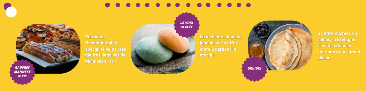 Find various sales points at the skylight area in the Exhibition Hall (Level -1), in the Riviera Hall (Level 0) and Lérins Hall (Level +1), as well as outside under the dining tent.
