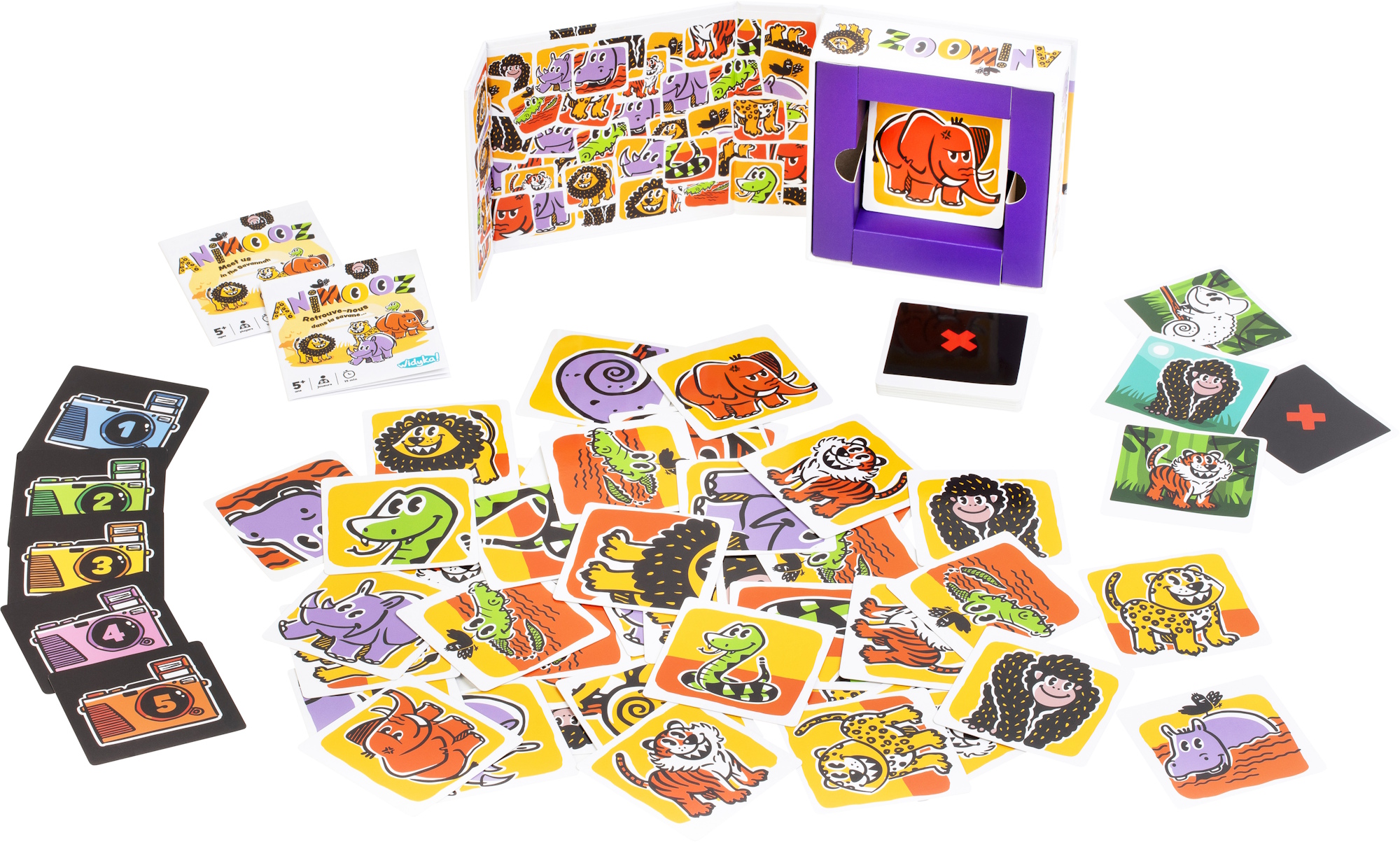 Tous les animaux se sont cachés dans la savane ! Saurez-vous retrouver l’animal désigné par la carte "Défi" avant les autres ? Combien y en a-t-il ? 2, 3 ? Si vous avez vu juste, vous remportez la carte "Défi", sinon vous serez pénalisé. Attention il y a des pièges ! Observez bien, soyez précis et rapide ! But du jeu : remporter 3 cartes "Défi" avant les autres.