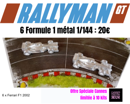 En étain à l'échelle 1/144, voitures adaptées aux plateaux des jeux RALLYMAN : GT, ces Formule 1 permettent de joueur à la règle F1 de l'auteur, non éditée : tableau de bord F1 à imprimer ici.