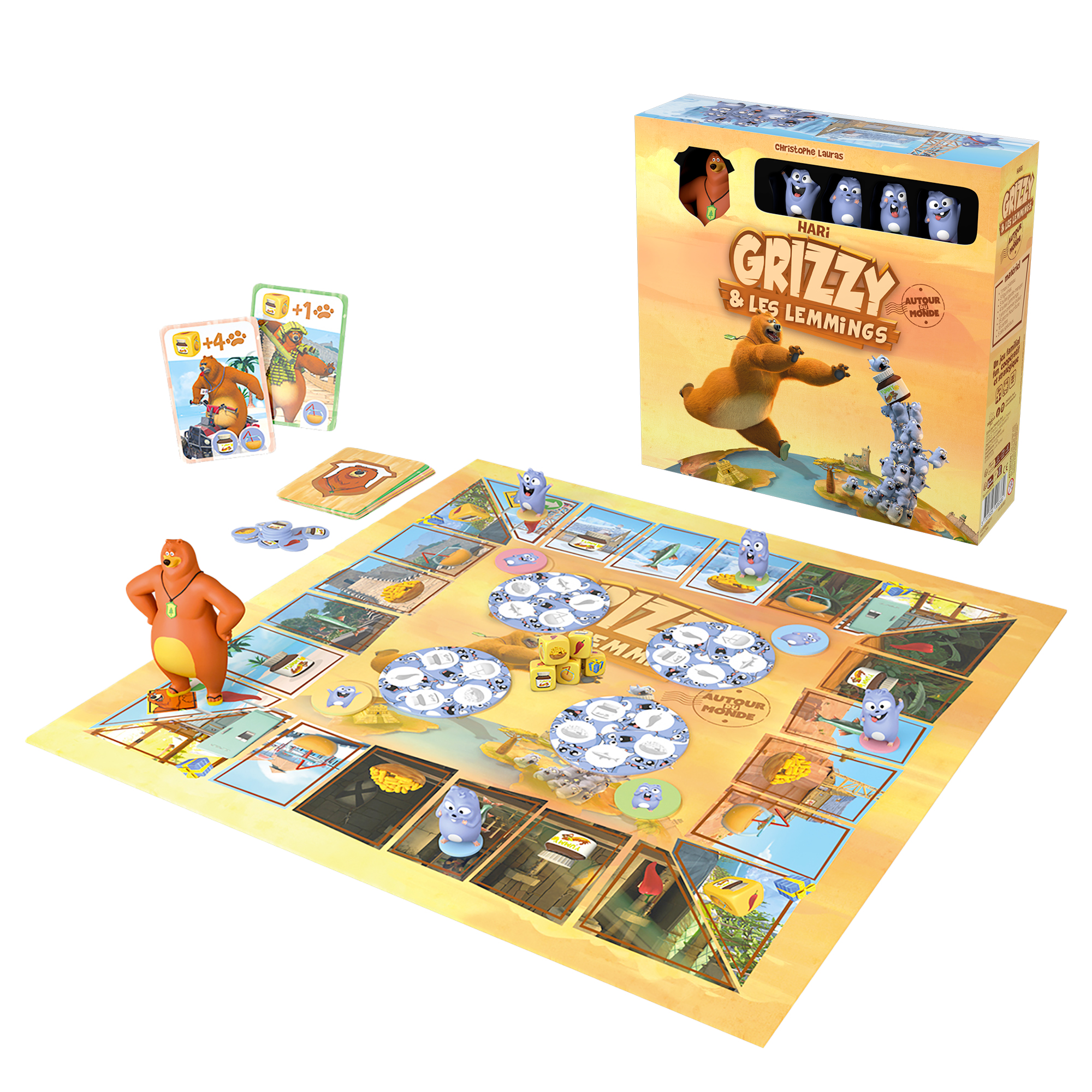 3-Esquivez Grizzy : Le dernier dé fait avancer Grizzy selon la carte tirée. S’il rattrape un Lemming, celui-ci perd une partie de sa nourriture.