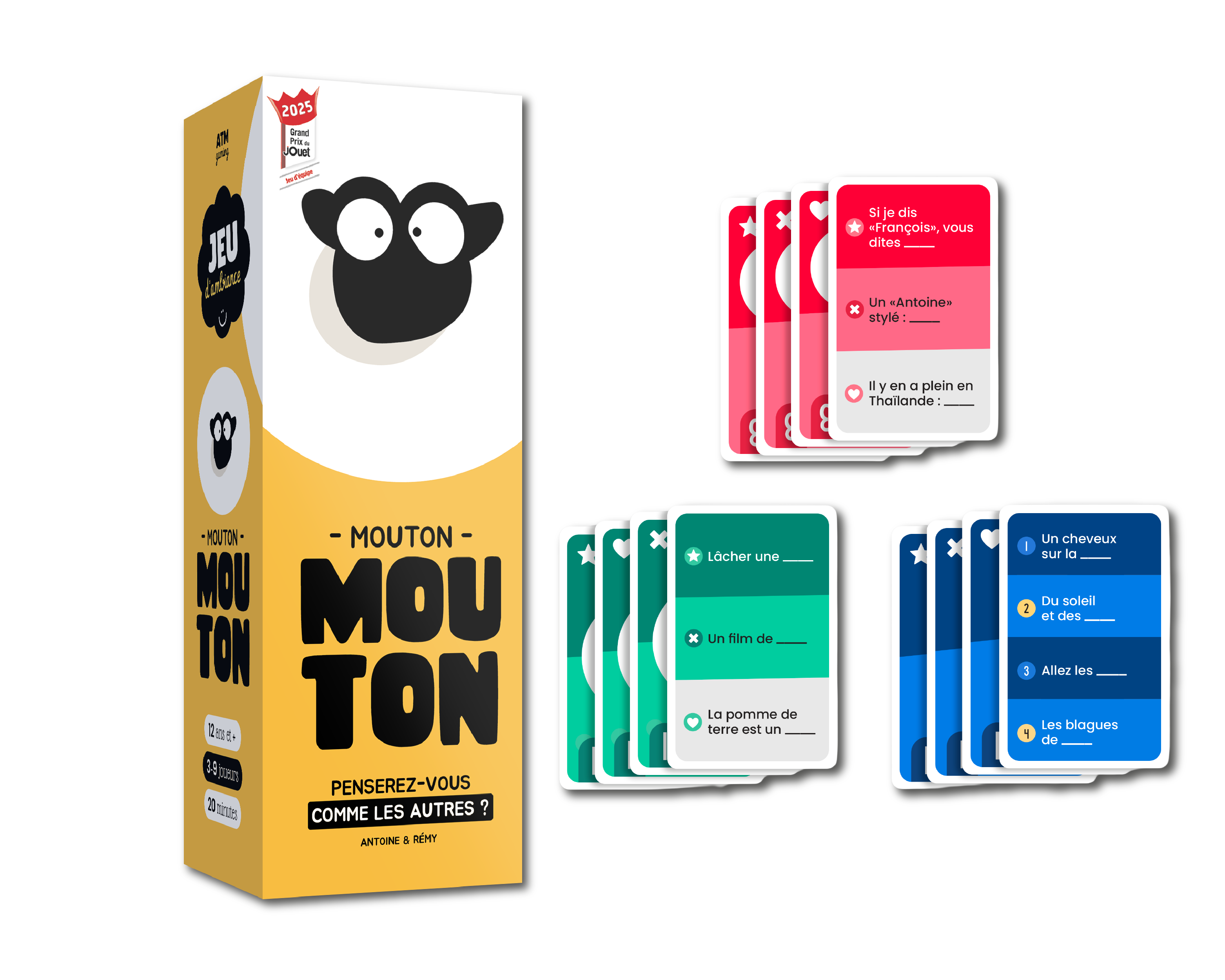 Mouton Mouton est un jeu d’ambiance coopératif et hilarant où l’objectif n’est pas d’être original, mais de penser comme les autres. En équipe, discutez juste ce qu’il faut, synchronisez vos cerveaux et répondez en même temps pour marquer des points… sans trop en dire !