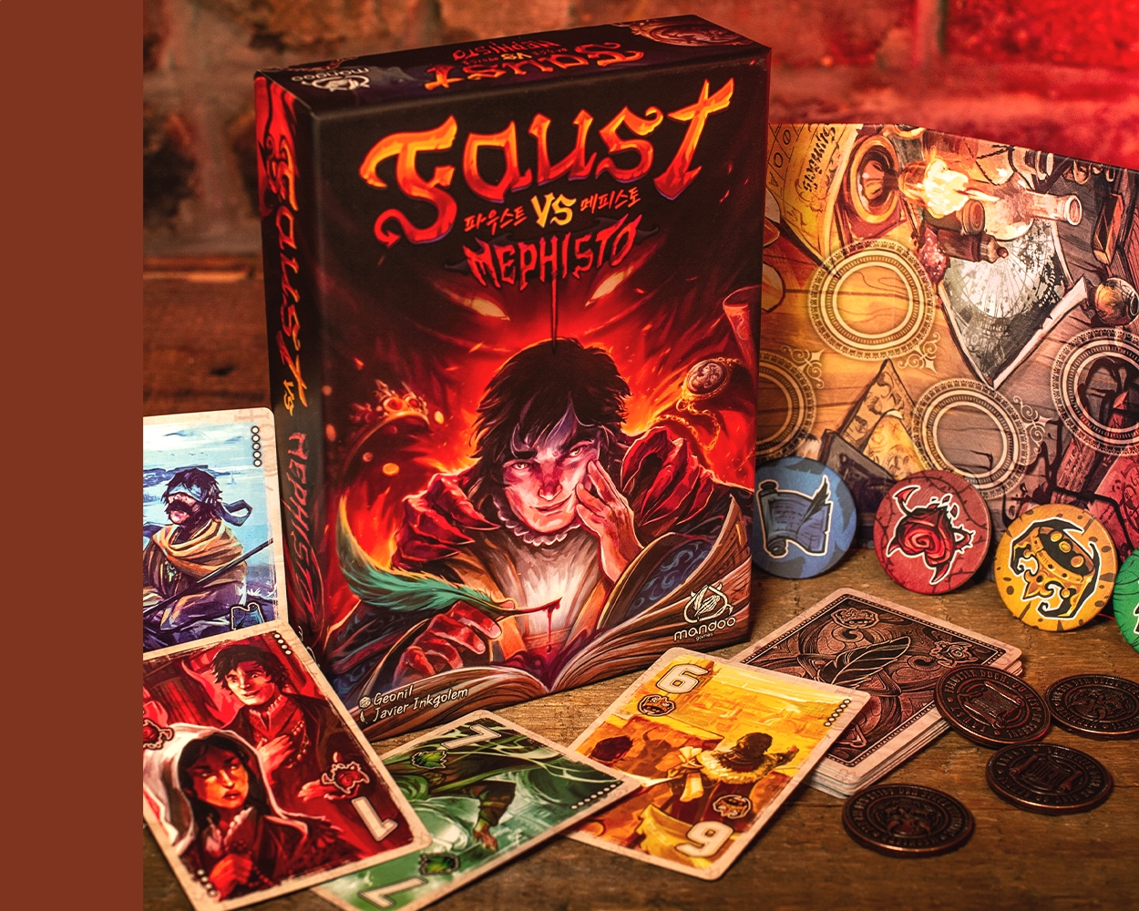 Faust vs Mephisto est un jeu de levées à deux joueurs dans lequel Faust doit résister à la tentation tout en explorant quatre domaines au cours de deux manches intenses.