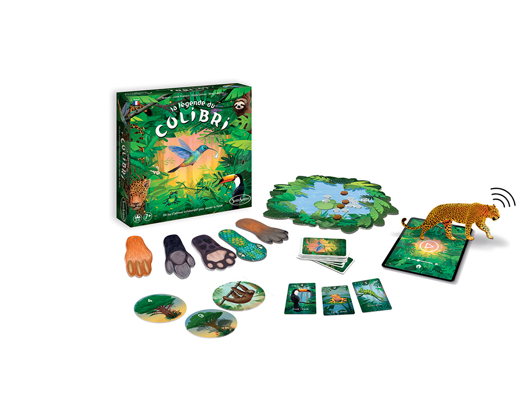 Dans un fond sonore de forêt exotique, munis d’une patte d’animal, les joueurs devront se passer de précieuses gouttes d’eau pour éteindre les feux, ainsi que des graines qui permettent aux arbres de repousser. Mais attention, éteindre l’incendie ne sera pas si facile : entre l’orage dont les éclairs effraient les animaux, et le jaguar qui rode, il faut redoubler de vigilance. Ce jeu coopératif mêle à la fois adresse, réflexes et valeurs fortes telles que la solidarité et l’entraide. Un jeu immersif qui ravira petits et grands.