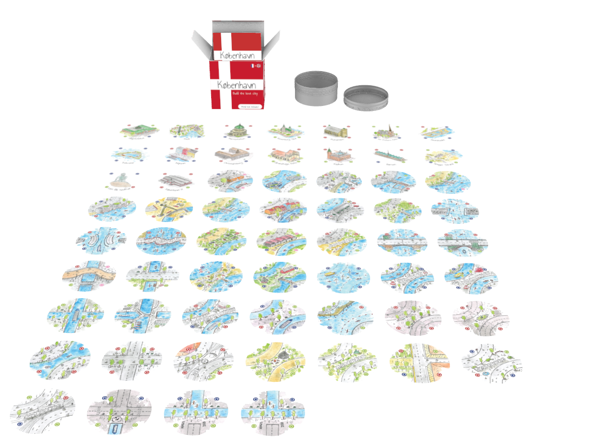 “København” est un jeu de placement de cartes dans lequel les joueurs construisent ensemble la ville de Copenhague. Connectez les routes et les canaux pour construire vos monuments Le gagnant est celui qui a réalisé le plus de monuments en fin de partie. Véritable hommage à la ville, chaque carte est unique avec des dessins des monuments iconiques de Copenhague.