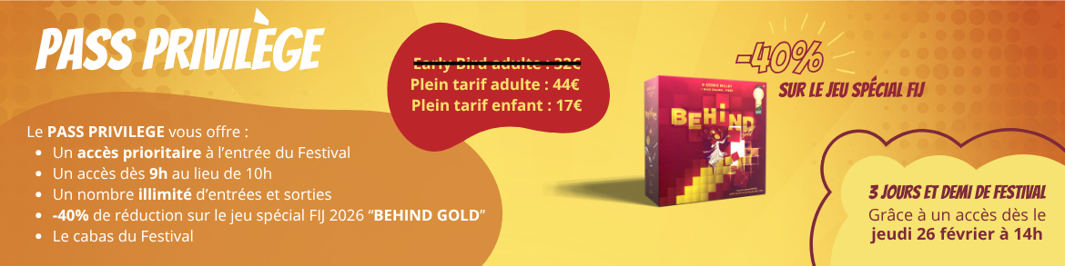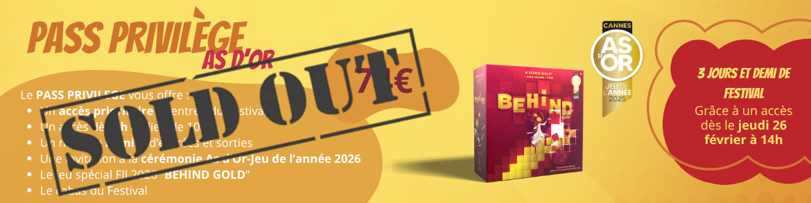 Le JEU SPÉCIAL FIJ "BEHIND GOLD" offert au PASS PRIVILEGE AS D’OR sera à récupérer en boutique officielle du Festival sur présentation de votre e-ticket.